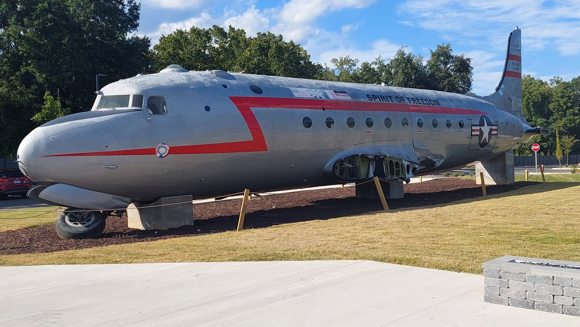 Next, we walked two blocks to the new brewery/entertainment complex. Our pictures cannot fully capture the magnitude of the new 44,140 square-foot brewery and distillery. The multiplex includes a full-service restaurant, a retail store, a drive-through coffee shop, and a large outdoor pavilion with a lawn. This is a BIG place! The centerpiece is the massive Hangar Bar that includes a very high ceiling (like a hangar), two jumbotron-like screens for sports, a large central bar, and a performance stage. On the west side of the lawn sits a wingless Douglass C-54 World War II airplane called “Spirit of Freedom,” which has a significant history dating back to the Berlin Airlift of 1948 (you can learn more about it here).