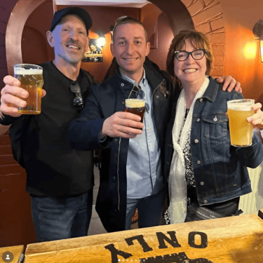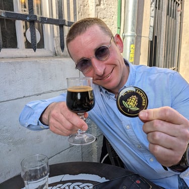 Rebecca shares a toast with Evtim at L' Antre Du Malt Craft Beer Pub in Rouen, France (Hit the Road Imperial Stout).